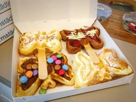 Eine heiße, frische Waffel gefällig? Im Café Waffeloase gibt es das Gebäck in verschiedenen Varianten. Von klassisch mit Puderzucker bis durchgedreht, ob herzförmig, rechteckig, rund oder als Schmetterling - bei unserer Waffelvielfalt ist hier für jeden etwas dabei!